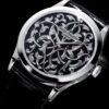 Luxury Watch Patek Philippe Calatrava Volutes and Arabesques, polished Platinum hand engraved platinum and black enamel case, 38mm, Reference 5088/100P-001 – combination of high watchmaking skills and masterly hand engraving. The lustrous polished 18k White Gold dial is striking and contrasts beautifully with the midnight black enamel. It showcases a rich pattern of scrolls and arabesques handcrafted by a craftsman inspired by antique firearms decor. Complementing the elegant dial are polished 18-carat white gold hands in the Dauphine style. A polished Platinum Screw-down crown with a ribbed edge for easy grip and the Patek Philippe logo is located on the right side of the case. The dial closed by a Scratch-resistant Sapphire Crystal. Sapphire-crystal too case back, which allows of the case, allows you to see the magical work of the movement. The watch features a Platinum fixed polished smooth bezel. This model has caliber Patek Philippe Caliber 240, an Ultra-thin self-winding mechanical movement containing 27 Jewels, with a power reserve of 48 hours. She is presented is on shiny black Alligator/Crocodile leather strap with square scales, hand-stitched and a striking platinum clasp with hand-engraved teeth. The water resistance is up to 30m/100ft (3 ATM).