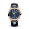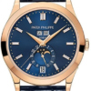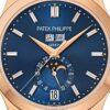 Unworn Luxury Patek Philippe Complication watch. The 18k Rose Gold Annual Calendar / Moonphases, 38,5mm, Reference 5396R-015. The model has Surprising aficionados with its stunning blue sunburst dial. The highlight of the model are baguette-cut diamonds (~0.26 ct), which act as hour markers. Against their background, elegantly carved arrows in the shape of a dauphin look cute. On the outer edge of the dial there is a minute scale consisting of 18k Rose Gold dots. The annual calendar is ingenious mechanism. Сonsists date in aperture located at 6 o’clock along with the day of the week and the month in apertures at 12 o’clock. Besides there is a 24-hour sub-dial at 6 o’clock and, perhaps the standout feature of this dial, a Moon phase within that. Polished 18k Rose Gold crown that with ribbed edge for comfortable grip and logo Patek Philippe are located on the right side of the case. The dial closed by a Scratch-resistant Sapphire Crystal and Scratch-resistant Sapphire Crystal case back. The watch is fixed 18k Rose Gold bezel. The watch Patek Philippe Caliber 324 S QA LU 24H/303 has Self-winding mechanical movement, containing 34 Jewels, and power reserve min. 35 hours, max. 45 hours. This model presented on shiny blue alligator leather strap secured by an 18k Rose Gold fold-over clasp. The water resistance is up to 30m/100ft (3 ATM).