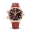 Luxury watch Patek Philippe Complication Calatrava Pilot Travel Time 42mm and Reference 5524R-001. This model was the continuation of a series of historical aviation watches produced by the manufactory in the 1930s. It features an easy-to-read a brown dial and a subtle black gradation toward the periphery.  The 18k Rose Gold wand hands with Super-LumiNova and large 18k Rose Gold applied Arabic numerals with Super-LumiNova enhance readability. The skeletonized GMT hand subtly indicates a second time zone: it is positioned behind the main hour hand and is thus hidden when local and home time are the same. There are separate day and night indicators for each time zone (local at 9 o’clock and home at 3 o’clock), as well as an additional date dial at 6 o’clock that displays the date in three-day increments to avoid clutter. In addition, on outer of the dial edge placed there is a around a railroad-style minute scale. Polished screw down winding 18k Rose Gold crown that with ribbed edge for comfortable grip and logo Patek Philippe are located on the right side of the case. In addition, the time zone polished 18k Rose Gold buttons (at 8 o’clock to move the clock forward and at 10 o’clock to return it) are equipped with a patented safety catch to prevent unintentional adjustments and are located on the left side. The dial closed by a Scratch-resistant Sapphire Crystal and Scratch-resistant Sapphire Crystal case back, which allows of the case, allows you to see the magical work of the movement.  The watch is equipped slightly inclined fixed polished 18k Rose Gold by a bezel. The watch Patek Philippe Caliber 26‑330 S C FUS has Self-winding mechanical movement, containing 29 Jewels, and power reserve min. 35 hours – max. 45 hours. This watch presented on Vintage brown hand-stitched Calfskin leather strap with 18k Rose Gold Clevis prong buckle. The water resistance is up to 60m/200ft (6 ATM).
