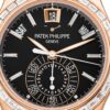 Luxury watch Patek Philippe Complication 18k Rose Gold, Flyback Chronograph with Annual Calendar 40,5mm, and Reference 5961R-010. The model has a striking Ebony black Opaline dial, and luminous leaf-style shape 18k Rose Gold hands. The dial decorate applied indexes from 8 baguette diamond hour markers (~0.23 ct). On the outer edge of the dial there is a minute scale. The patented annual calendar is ingenious mechanism in three apertures arranged along an arc in the upper half of the dial. In its composition Date display at the 12 o’clock position, Day of the week display at the 10 o’clock position, Month display at the 2 o’clock position. Monocounter dial at 6 o’clock records minutes around outer circle. Hours and half-hours are read off another concentric inner circle (up to 12 hours). Chronograph incorporates flyback feature. Chrono is activated by pusher at 2 o’clock and reset/flyback at 4 o’clock. Power Reserve display at 12 o’clock position. The features can be set with the three discreet selectors on the left of the case. Polished 18k Rose Gold Screw-down crown that with ribbed edge for comfortable grip and logo Patek Philippe and polished 18k Rose Gold chronograph buttons are on the right side of the case. The dial closed by a Scratch-resistant Sapphire Crystal and Scratch-resistant Sapphire Crystal case back. The watch is equipped fixed polished 18k Rose Gold by a bezel set with 36 baguette diamonds (~3.48 ct). The watch Patek Philippe Caliber CH 28‑520 IRM QA 24H has manually wound mechanical movement, containing 40 Jewels, and power reserve min. 45 hours, max. 55 hours. This watch presented on matte black Alligator leather with square scales, hand-stitched, 18k Rose Gold Fold-over clasp set with 22 baguette diamonds (~0.97 ct). The water resistance is up to 30m/100ft (3 ATM).
