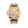 Luxury watch Patek Philippe Complication 18k Rose Gold, Flyback Chronograph with Annual Calendar 42mm, and Reference 5905R-001. The model has a striking brown sunburst dial, gradually grading to black at the periphery, and luminous dauphine-style 18k Rose Gold hands. The dial decorate large applied 18k Rose Gold indexes hour markers. On the outer edge of the dial there is a minute scale with luminous dots against each hour marker. The patented annual calendar is ingenious mechanism in three apertures arranged along an arc in the upper half of the dial. In its composition Date display at the 12 o’clock position, Day of the week display at the 10 o’clock position, Month display at the 2 o’clock position. At the 6 o’clock position there is sub-dial a small second hand and Arabic numerals after 10 seconds. Day/night indication displayed in apertures. The features can be set with the three discreet selectors on the side of the case. Polished 18k Rose Gold Screw-down crown that with ribbed edge for comfortable grip and logo Patek Philippe and polished 18k Rose Gold chronograph buttons are on the right side of the case. The dial closed by a Scratch-resistant Sapphire Crystal and Scratch-resistant Sapphire Crystal case back. The watch is equipped fixed polished 18k Rose Gold by a bezel. The watch Patek Philippe Caliber CH 28‑520 QA 24H has manually wound mechanical movement, containing 37 Jewels, and power reserve min. 45 hours, max. 55 hours. This watch presented on shiny black Alligator leather with square scales, hand-stitched, 18k Rose Gold Prong buckle. The water resistance is up to 30m/100ft (3 ATM).