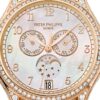 Unworn Luxury Ladies Patek Philippe Complication watch. The 18k Rose Gold case set with 347 diamonds (~2.65 ct) Annual Calendar, 38mm, Reference 4948R-001. The model has elegant White Balinese mother-of-pearl dial with luminous 18k Rose Gold leaf-style hands and graceful 18k Rose Gold Center sweep second hand. The dial decorate large 18k Rose Gold hour markers in the form Arabic numeral. A minute scale is applied along its outer edge. The patented annual calendar is ingenious mechanism which displaying three multi-function sub-dials: month display at the 3 o’clock position; day of the week display at the 9 o’clock position; moonphase display at the 6 o’clock position. In addition, below it at the 6 o’clock position, there is a date display in the aperture. Screw-down 18k Rose Gold crown, that logo Patek Philippe decorated set with 14 diamonds (~0.06 ct). The dial closed by a Scratch-resistant Sapphire Crystal and Scratch-resistant Sapphire Crystal case back. The watch is polished fixed 18k Rose Gold bezel set with 64 diamonds. The watch Patek Philippe Caliber 324 S QA LU has Self-winding mechanical movement, containing 34 Jewels, and power reserve min. 35 hours, max. 45 hours. This model presented on matte pearly white alligator leather strap with square scales, hand-stitched secured by an 18k Rose Gold set with 27 diamonds (~0.21 ct) Prong buckle. The water resistance is up to 30m/100ft (3 ATM).