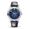 Unworn Luxury Patek Philippe Complication watch. The 18k White Gold Annual Calendar / Moonphases, 40mm, Reference 5205G-013. The model has elegant sunburst dial in two tones of blue shading to black. The 18k White Gold applied index hour markers, luminescent hands, and the Patek Philippe logo at 12 o’clock. On the outer edge of the dial there is a minute scale consisting of 18k White Gold dots. The patented annual calendar is ingenious mechanism in three apertures arranged along an arc in the upper half of the dial. In its composition Date display at the 12 o’clock position, Day of the week display at the 10 o’clock position, Month display at the 2 o’clock position. Single combination sub-dial displaying: 24 hours and (inner moonphase) at the 6 o’clock position. Polished Pull/push18k White Gold crown that with ribbed edge for comfortable grip and logo Patek Philippe are located on the right side of the case. The dial closed by a Scratch-resistant Sapphire Crystal and Scratch-resistant Sapphire Crystal case back. The watch is fixed slightly concave 18k White Gold bezel. The highlight of this model is the delicately pierced lugs for strap. The watch Patek Philippe Caliber 324 S QA LU 24H/206 has Self-winding mechanical movement, containing 34 Jewels, and power reserve min. 35 hours, max. 45 hours. This model presented on shiny black alligator strap secured by an 18k White Gold Prong buckle. The water resistance is up to 30m/100ft (3 ATM).