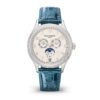 Unworn Luxury Ladies Patek Philippe Complication watch. The 18k White Gold set with 155 diamonds (~1.34 ct) Annual Calendar, 38mm, Reference 4947G-010. The model has elegant Silvery dial with vertical and horizontal satin-finished reminiscent of wild shantung silk and luminous 18k White Gold leaf-style hands and graceful 18k White Gold Center sweep second hand. The dial decorate large 18k White Gold hour markers in the form Arabic numeral. A minute scale is applied along its outer edge. The patented annual calendar is ingenious mechanism which displaying three multi-function sub-dials: month display at the 3 o’clock position; day of the week display at the 9 o’clock position; moonphase display at the 6 o’clock position. In addition, below it at the 6 o’clock position, there is a date display in the aperture. Screw-down 18k White Gold crown, that logo Patek Philippe decorated set with 14 diamonds (~0.06 ct). The dial closed by a Scratch-resistant Sapphire Crystal and Scratch-resistant Sapphire Crystal case back. The watch is polished fixed 18k White Gold bezel set with 64 diamonds. The watch Patek Philippe Caliber 324 S QA LU has Self-winding mechanical movement, containing 34 Jewels, and power reserve min. 35 hours, max. 45 hours. This model presented on shiny peacock blue alligator leather strap with square scales, hand-stitched secured by an 18k White Gold Prong buckle. The water resistance is up to 30m/100ft (3 ATM).