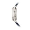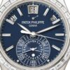 Luxury watch Patek Philippe Complication Platinum, Flyback Chronograph with Annual Calendar 40,5mm, and Reference 5961P-001. The model has a striking Matte blue Opaline dial, and luminous leaf-style shape 18k Rose Gold hands. The dial decorate applied indexes from 8 baguette diamond hour markers (~0.23 ct). On the outer edge of the dial there is a minute scale. The patented annual calendar is ingenious mechanism in three apertures arranged along an arc in the upper half of the dial. In its composition Date display at the 12 o’clock position, Day of the week display at the 10 o’clock position, Month display at the 2 o’clock position. Monocounter dial at 6 o’clock records minutes around outer circle. Hours and half-hours are read off another concentric inner circle (up to 12 hours). Chronograph incorporates flyback feature. Chrono is activated by pusher at 2 o’clock and reset/flyback at 4 o’clock. Power Reserve display at 12 o’clock position. The features can be set with the three discreet selectors on the left of the case. Polished Platinum Screw-down crown that with ribbed edge for comfortable grip and logo Patek Philippe and polished Platinum chronograph buttons are on the right side of the case. The dial closed by a Scratch-resistant Sapphire Crystal and Scratch-resistant Sapphire Crystal case back. The watch is equipped fixed polished Platinum by a bezel set with 36 baguette diamonds (~3.48 ct). The watch Patek Philippe Caliber CH 28‑520 IRM QA 24H has manually wound mechanical movement, containing 40 Jewels, and power reserve min. 45 hours, max. 55 hours. This watch presented on shiny navy blue Alligator leather with square scales, hand-stitched, Platinum Fold-over clasp set with 22 baguette diamonds (~0.97 ct). The water resistance is up to 30m/100ft (3 ATM).
