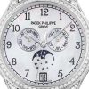 Discover the Patek Philippe Complications 4948G-010, a splendid showcase of luxury and intricate design. Crafted from 18k white gold, this 38mm ladies’ watch embodies sophistication, making it an exquisite addition to any collection. The dial is a stunning Balinese mother-of-pearl, featuring gold applied numerals and hands that exude elegance. A highlight of this timepiece is its annual calendar mechanism, which correctly displays the month, day, and date, and requires adjustment only once a year. This function is beautifully integrated into the design with sub-dials at 12 and 6 o’clock, and a date aperture gracefully set at 6 o’clock. The moon phase display at 6 o’clock adds an artistic touch, enhancing the watch’s allure with its celestial accuracy. Set with 347 diamonds (~2.65 ct.) along the bezel, lugs, and crown, each gem is meticulously placed to maximize brilliance and charm. This detailed gem setting not only emphasizes the watch’s luxurious appeal but also highlights the impeccable craftsmanship of Patek Philippe. The watch is powered by the caliber 324 S QA LU, a self-winding mechanical movement renowned for its precision and reliability, visible through the sapphire-crystal case back. A white gold bracelet complements the case, providing a secure and stylish fit with a fold-over clasp.