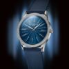 Luxury Patek Philippe Ladies’ Calatrava, 18k White Gold, 35mm and Reference 4997/200G-001 -new take on an old classic. This model has a hypnotic guilloche lacquered dial in dark blue. Wavy concentric waves are buried in capricious translucent blue varnish. The effect is quite dreamy as light and shadows dance across the dial from different angles. Above this space, 18k White Gold Poudre arrow-shaped hour markers and faceted 18k White Gold Dauphine hands shimmer. The hands and hour markers follow the shape of each other, reminiscent of a magnificent sundial floating in the sky. A polished 18k White Gold Screw-down crown with a ribbed edge for easy grip and the Patek Philippe logo is located on the right side of the case. The dial closed by a Scratch-resistant Sapphire Crystal and sapphire-crystal case back which allows of the case, allows you to see the magical work of the movement. The watch is equipped Luxury fixed polished 18k White Gold bezel set with 76 flawless Top Wesselton round diamonds (~0.52 ct). This model has received the best ultra-thin caliber Patek Philippe Caliber 240, a self-winding mechanical movement containing 27 precious stones, with a power reserve of 48 hours. She is presented on is on shiny navy blue Brushed calfskin leather strap with satinated finish which the zips up 18k White Gold Prong buckle. The water resistance is up to 30m/100ft (3 ATM).