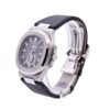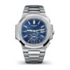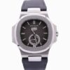 Unworn Patek Philippe Nautilus Annual Calendar, 40.5mm, Stainless Steel Watch. Black Dial with luminous hands and stick hour markers with luminescent fill. Minute markers around the outer rim. Annual calendar complication with day, date, and month is shown in apertures. Date display at the 6 o’clock position. Day of the week and month at the 12 o’clock position. 24-hour and moon phase sub-dial at the 6 o’clock position subdials. The watch dial is protected by a Scratch-resistant sapphire crystal. They have a screw-down crown and transparent sapphire crystal case back. The shape of the watchcase is a Cushion. Fixed silver-tone Stainless Steel bezel. This model has the following features: annual calendar, moon phase, month, date, day, GMT, second-time zone, hour, minute, second. The movement is mechanical self-winding Patek Philippe Caliber 324 S QA LU 24H/303 containing 34 Jewels and has a power reserve of approximately 45 hours. The watch presented on a black crocodile/alligator leather strap with Fold over with a safety release clasp. The water resistance is up to 120m/400ft.