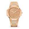 Ladies Watch Patek Philippe Nautilus Stainless Steel case with polished and satin finishes, 35,2mm, Reference 7118/1A-001 – has been the standard in luxury, because combine elegance, sporty style and timeless design. Is striking watch boasts a Blue Opaline with horizontally embossed dial, 18k White Gold applied hour markers and Arabic numeral at the 12 o’clock positioning with a luminescent coating for easy readability in dim lighting as well as Dot minute markers around the outer rim. The sweep seconds hand and date in an aperture features at the 6 o’clock positioning give this model a clean profile and make keeping track of both date and time convenient. Complementing the elegant dial are 18k White Gold polished luminous alpha-style shape hands. A polished Stainless Steel Screw-down crown with a ribbed edge for easy grip and the Patek Philippe logo is completes the watch’s harmony. The dial closed by a Scratch-resistant Sapphire Crystal. Sapphire-crystal too case back, which allows of the case, allows you to see the magical work of the movement. The wide rounded octagonal with polished and satin finishes bezel, in a Stainless Steel, provides a wide view of the dial as the horizon is visible through the porthole. Moreover, the side protrusions, also called “lugs”, are inspired by the hinges on these windows. The Model has caliber Patek Philippe Caliber 324 S C, with a self-winding mechanical movement containing 29 Jewels, with a power reserve of min. 35 hours – max. 45 hours. In addition, this beautiful sport-chic watch on presented on the Stainless Steel bracelet with polished and satin finishes and Stainless Steel Nautilus fold-over clasp. The water resistance is up to 60m/200ft (6 ATM).