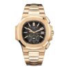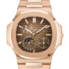 Patek Philippe Nautilus Moon Phase Rose Gold Watch 5712/1R-001 5712/1R Self-winding mechanical movement. Caliber 240 PS IRM C LU. Date by hand. Moon phases. Power reserve indication. Small seconds. Dial Sunburst brown, black-gradient rim, horizontally embossed, gold applied hour markers with luminescent coating. Case Rose gold. Screw-down crown. Sapphire crystal case back. Water-resistant to 60 m. Diameter (10–4 o’clock): 40 mm. Height: 8.52 mm.