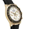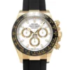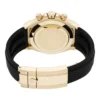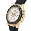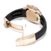 The 18 ct gold versions of the Cosmograph Daytona with a Cerachrom bezel are available with an Oysterflex bracelet. Developed by Rolex and patented, it singularly combines the robustness of a metal bracelet with the comfort of an elastomer bracelet. It is made up of two flexible curved metal blades – one in each bracelet section – overmoulded with high-performance black elastomer. For optimum comfort, the Oysterflex bracelet is equipped with cushions on its inner sides and an Oysterlock safety clasp to prevent accidental opening. Its length may be adjusted via the ingenious Rolex Glidelock extension system.