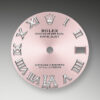 - Dial color: Pink dial with a fine sunrays, applied polished 18k White Gold Roman numerals as hour markers and 11 diamonds on large numeral VI