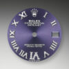 - Dial color: Aubergine dial with a fine sunrays, applied polished 18k White Gold Roman numerals as hour markers and 11 diamonds on large numeral VI