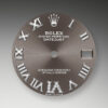 - Dial color: Dark grey dial with a fine sunrays, applied polished 18k White Gold Roman numerals as hour markers and 11 diamonds on large numeral VI