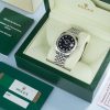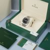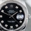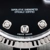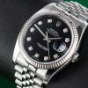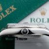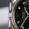 This dial features diamonds in 18 ct gold settings. The sunray finish creates delicate light reflections on many dials in the Oyster Perpetual collection. It is obtained using masterful brushing techniques that create grooves running outwards from the centre of the dial. Light is diffused consistently along each engraving, creating a characteristic subtle glow that moves depending on the position of the wrist. Once the sunray finish has been completed, the dial colour is applied using Physical Vapour Deposition or electroplating. A light coat of varnish gives the dial its final look.