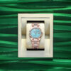 Unworn watch Rolex Day-Date 36, 18k Everose Gold with Diamond-set, 36mm, Ref# 128235-0064. New for 2023 in the Oyster Perpetual Day-Date 36, series are watches with dials made of decorative stones. Thanks to the unique crystallized effects, matrices and veins of aventurine, carnelian and turquoise, and their skillful processing, each dial turns into a unique work of art, being a worthy addition to the rest of the flawless Day-Date details. As always elegant and luxurious Day-Date 36 – is an excellent choice for people who appreciate unique beauty, high style and absolute comfort. The turquoise dial will not leave indifferent any connoisseur of beauty and sophistication. Its index hour markers and Roman numerals VI and IX in 18k Everose Gold are respectively set with 32 and 24 diamonds, using a flawless setting and leveling technique that highlights the stones’ subtle brilliance. The classic polished hands made of 18k Everose Gold look amazing on such a dial, emphasizing the sophistication of the model. The date indicator is traditionally placed at the 3 o’clock position. At the 12 o’clock, position is a semi-circular window showing the day of the week in full, providing an instantly recognizable, unique design of Day-Date. The ribbed screw-down crown in 18k Everose Gold Triplock with double watertight system, adorned with the Rolex logo, is a traditionally recognizable part of Rolex watches. The dial is covered with a scratch-resistant anti-reflective sapphire crystal and a Cyclops lens above the date with double anti-reflective coating. A solid 18k Everose Gold screw-down case back with fine fluted edges, closes the movement. The fluted fixed 18k Everose Gold bezel is not only an aesthetic element of this watch, but also a true hallmark of Rolex. The in-house Rolex mechanical movement, caliber 3255, contains 31 jewels and has an approximate power reserve of approximately 70 hours powers. This delightful timepiece is presented on an 18k Everose Gold President bracelet with semi-circular 3-piece links for flawless beauty. It features Rolex’s original concealed folding Crownclasp to secure the watch on your wrist. Water resistant up to 100m/330ft (10 ATM).