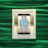Unworn watch Rolex Day-Date 36, 18k White Gold, 36mm, Ref# 128239-0045. New for 2023 in the Oyster Perpetual Day-Date 36, series are watches with dials made of decorative stones. Thanks to the unique crystallized effects, matrices and veins of aventurine, carnelian and turquoise, and their skillful processing, each dial turns into a unique work of art, being a worthy addition to the rest of the flawless Day-Date details. As always elegant and luxurious Day-Date 36 – is an excellent choice for people who appreciate unique beauty, high style and absolute comfort. The turquoise dial will not leave indifferent any connoisseur of beauty and sophistication. Its index hour markers and Roman numerals VI and IX in 18k White Gold are respectively set with 32 and 24 diamonds, , using a flawless setting and leveling technique that highlights the stones’ subtle brilliance. The classic polished hands made of 18k White Gold look amazing on such a dial, emphasizing the sophistication of the model. The date indicator is traditionally placed at the 3 o’clock position. At the 12 o’clock, position is a semi-circular window showing the day of the week in full, providing an instantly recognizable, unique design of Day-Date. The ribbed screw-down crown in 18k White Gold Triplock with double watertight system, adorned with the Rolex logo, is a traditionally recognizable part of Rolex watches. The dial is covered with a scratch-resistant anti-reflective sapphire crystal and a Cyclops lens above the date with double anti-reflective coating. A solid 18k White Gold screw-down case back with fine fluted edges, closes the movement. The fluted fixed 18k White Gold bezel is not only an aesthetic element of this watch, but also a true hallmark of Rolex. The in-house Rolex mechanical movement, caliber 3255, contains 31 jewels and has an approximate power reserve of approximately 70 hours powers. This delightful timepiece is presented on an 18k White Gold Diamond-set President bracelet with semi-circular 3-piece links for flawless beauty. It features Rolex’s original concealed folding Crownclasp to secure the watch on your wrist. Water resistant up to 100m/330ft (10 ATM).