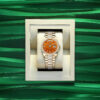 Unworn watch Rolex  Day-Date 36, 18k Yellow Gold, 36mm, Ref# 128348rbr-0050. New for 2023 in the Oyster Perpetual Day-Date 36, series are watches with dials made of decorative stones. Thanks to the unique crystallized effects, matrices and veins of aventurine, carnelian and turquoise, and their skillful processing, each dial turns into a unique work of art, being a worthy addition to the rest of the flawless Day-Date details. As always elegant and luxurious Day-Date 36 – is an excellent choice for people who appreciate unique beauty, high style and absolute comfort. The dial is carved from Carnelian, an orange-colored stone characterized by lines of various shapes and sizes, forming an intricate cameo of patterns. Its index hour markers and Roman numerals VI and IX in 18k Yellow Gold are respectively set with 32 and 24 diamonds, using a flawless setting and leveling technique that highlights the stones’ subtle brilliance. The classic polished hands made of 18k Yellow Gold look amazing on such a dial, emphasizing the sophistication of the model. The date indicator is traditionally placed at the 3 o’clock position. At the 12 o’clock, position is a semi-circular window showing the day of the week in full, providing an instantly recognizable, unique design of Day-Date. The ribbed screw-down crown in 18k Yellow Gold Triplock with double watertight system, adorned with the Rolex logo, is a traditionally recognizable part of Rolex watches. The dial is covered with a scratch-resistant anti-reflective sapphire crystal and a Cyclops lens above the date with double anti-reflective coating. A solid 18k Yellow Gold screw-down case back with fine fluted edges, closes the movement. Fixed 18k Yellow Gold bezel set with 52 brilliant-cut diamonds – sparkling a symphony that will adorn the watch and enchant its owner. The in-house Rolex mechanical movement, caliber 3255, contains 31 jewels and has an approximate power reserve of approximately 70 hours powers. This delightful timepiece is presented on an 18k Yellow Gold Diamond-set President bracelet with semi-circular 3-piece links for flawless beauty. It features Rolex’s original concealed folding Crownclasp to secure the watch on your wrist. Water resistant up to 100m/330ft (10 ATM).