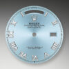 - Dial color: Ice blue dial with a fine sunrays and a applied polished 18k White Gold Roman numerals as hour markers