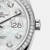 - Dial color: White mother-of-pearl dial with 10 Diamonds as hour markers framed in 18k White Gold, 2 of which are baguette-cut at 6 and 9 o’clock