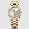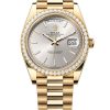 Unworn watch Rolex Day-Date 36, 18k Yellow Gold with Diamond-set, 40mm, Ref# 228348rbr-0042. Prestigious Day-Date watches remain at the cutting edge of modernity, despite the many decades passing by. As always elegant and luxurious, they are an excellent choice for people who value unique beauty, high style and absolute comfort. New for 2023 in the Rolex Day-Date 40 line is a model with a Silver dial sunray finish creates delicate light, with highly legible Chromalight display with long-lasting blue luminescence. Its classic polished index hour markers and hands made of 18k Yellow Gold with lumins fill look amazing on such a dial, emphasizing the sophistication of the model. The date indicator is traditionally placed at the 3 o’clock position. At the 12 o’clock, position is a semi-circular window showing the day of the week in full, providing an instantly recognizable, unique design of Day-Date. The ribbed screw-down crown in 18k Yellow Gold Triplock with double watertight system, adorned with the Rolex logo, is a traditionally recognizable part of Rolex watches. The dial is covered with a scratch-resistant anti-reflective sapphire crystal and a Cyclops lens above the date with double anti-reflective coating. A solid 18k Yellow Gold screw-down case back with fine fluted edges, closes the movement. The fixed polished 18k Yellow Gold bezel set with 48 diamonds, a chic element that gives the watch a unique brilliance. The in-house Rolex mechanical movement, caliber 3255, contains 31 jewels and has an approximate power reserve of approximately 70 hours powers. This delightful timepiece is presented on an 18k Yellow Gold President bracelet with semi-circular 3-piece links for flawless beauty. It features Rolex’s original concealed folding Crownclasp to secure the watch on your wrist. Water resistant up to 100m/330ft (10 ATM).