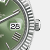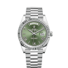 - Dial color: Olive green dial with a fine sunrays and applied large polished 18k White Gold Roman numerals as hour markers