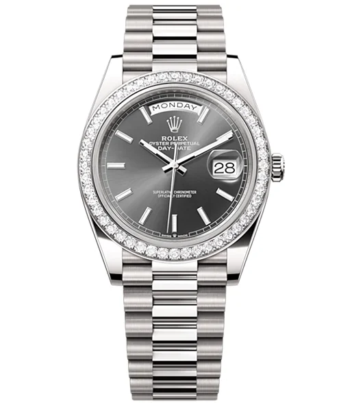 Unworn Rolex Day-Date 40mm, 18k White Gold and Diamonds watch. They have a Slate Dial with index hour markers fashioned from 18k gold. Highly legible Chromalight display with long-lasting blue luminescence. Monobloc middle case, screw-down case back. Screw-down winding crown with Twinlock double waterproofness system. Scratch-resistant sapphire, Cyclops lens over the date. The date window is located at the 3 o’clock position. Day display located at the 12 o’clock position. The Fixed 18k White Gold bezel with 52 Diamonds set. The movement is mechanical self-winding, caliber 3255 with 31 jewels and 70 hours of power reserve. The 18k White Gold President bracelet of semi-circular three-piece links with concealed folding Crownclasp. The water resistance is up to 100m/330ft. The Watch comes complete with store papers and a Rolex box. Will include 3 years Store Warranty.
