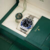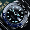 This model features a black dial and a two-colour Cerachrom bezel insert in blue and black ceramic. In addition to conventional hour, minute and seconds hands, the GMT-Master II features an arrow-tipped hand, which circles the dial once every 24 hours, as well as a bidirectional rotatable 24-hour graduated bezel. The distinctively coloured 24-hour hand displays the “home†reference time in a first time zone which can be read on the graduations on the bezel. The traveller’s local time is easily set by “jumping†from hour to hour, thanks to an ingenious mechanism operated via the winding crown: the hour hand can be adjusted forwards or backwards independently of the minute and seconds hands. This allows travellers to adapt to their new time zone without affecting the precision of their timekeeping.