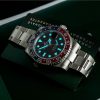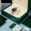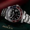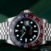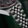 This model features a black dial and a two-colour Cerachrom bezel insert in red and blue ceramic. In addition to conventional hour, minute and seconds hands, the GMT-Master II features an arrow-tipped hand, which circles the dial once every 24 hours, as well as a bidirectional rotatable 24-hour graduated bezel. The distinctively coloured 24-hour hand displays the “home†reference time in a first time zone which can be read on the graduations on the bezel. The traveller’s local time is easily set by “jumping†from hour to hour, thanks to an ingenious mechanism operated via the winding crown: the hour hand can be adjusted forwards or backwards independently of the minute and seconds hands. This allows travellers to adapt to their new time zone without affecting the precision of their timekeeping.