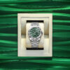 Unworn watch Rolex Sky-Dweller, 42mm, Oystersteel and 18k White Gold, Ref# 336934-0002. New for 2023, a true masterpiece of engineering. Elegant and versatile, this stunning timepiece is the perfect luxury accessory for the modern traveler. This superb chronometer features a Mint green dial, which is the perfect backdrop for the luminous 18k White Gold index hour markers and hands, making it easy to read the time even in low light conditions. A well-readable minute scale is applied along the outer contour of the dial. The sophisticated multi-function display makes it easy to keep track of the time in two different time zones. The reference time is displayed in 24-hour format on an off-center dial, while the local time is read using the normal central hands. The annual calendar, named Saros, is powered by a patented mechanism and features an innovative display: the months of the year are shown in 12 windows around the circumference of the dial, behind the hour marker – the current month is displayed in red. The instantaneous date change is related to local time. The ribbed, easy-to-grip Triplock Oystersteel screw-down crown features a triple water-resistance system in and Rolex logo decorated. The dial is covered with a scratch-resistant sapphire crystal with anti-reflective coating and Cyclops lens at the 3 o’clock position. The fluted bezel in 18k White Gold is a true hallmark of Rolex. Bidirectional rotatable, it is part of the Ring Command system and, when interacting with the crown, allows the user to select watch functions one by one and adjust them easily, quickly and simply. The model is powered by the innovative in-house Rolex mechanical movement, caliber 9002, contains 29 jewels and has an approximate power reserve of approximately 72 hours. This delightful timepiece is presented on a Jubilee bracelet with five-piece links in Oystersteel. Thanks to the new hidden fastening system under the bezel, there is a perfect visual continuity between the bracelet and the case. The bracelet features an Oysterclasp folding clasp with Rolex’s original Easylink patented quick extension system of approximately 5mm for added comfort in all circumstances. Water resistant up to 100m/330ft (10 ATM).