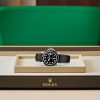 The Yacht-Master’s new Oysterflex bracelet, developed and patented by Rolex, offers a sporty alternative to metal bracelets. The bracelet attaches to the watch case and the Oysterlock safety clasp by a flexible titanium and nickel alloy metal blade. The blade is overmoulded with high-performance black elastomer which is particularly resistant to environmental effects, very durable and perfectly inert for the wearer of the watch. For enhanced comfort, the inside of the Oysterflex bracelet is equipped with a patented longitudinal cushion system that stabilizes the watch on the wrist and fitted with an 18 ct yellow gold Oysterlock safety clasp. It also features the Rolex Glidelock extension system, designed and patented by the brand. This inventive toothed mechanism, integrated beneath the clasp, allows fine adjustment of the bracelet length by some 15 mm in increments of approximately 2.5 mm, without the use of tools.