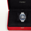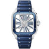 Cartier Santos de Cartier Large Skeleton/Blue Dial Men’s Watch WHSA0026. Stainless steel 47.5mm x 39.7mm case and blue bezel all on a matching stainless steel bracelet and comes complete with complimentary blue rubber strap. This men’s watch features a skeleton dial with blue structure. Synthetic sapphire crystal glass and water resistant up to 100m. Power reserve up to 72 hours. Manual-wind movement.
