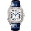 Cartier Santos de Cartier Medium Diamond Set Automatic 18ct White Gold Watch WJSA0014. 18ct white gold 35.1mm case and diamond pave set bezel set with 206 brilliant cut diamonds (0.64ct) all on a grey leather strap and comes complete with an additional blue alligator leather strap. This watch features a silver sunray dial with blued hands and black hour numerals. Water resistant up to 100m and sapphire crystal glass. Calibre 1847 MC automatic movement.