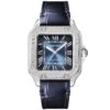 Cartier Santos de Cartier Medium Diamond Set Automatic Steel Bracelet/Strap Watch W4SA0006. Stainless steel 35.1mm case and diamond pave set bezel set with 206 brilliant cut diamonds (0.64ct) all on a matching stainless steel bracelet and comes complete with an additional blue alligator leather strap. This watch Features a blue sunray dial with polished hands and hour numerals. Water resistant up to 100m and sapphire crystal glass. Calibre 1847 MC automatic movement.