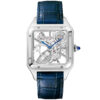 Cartier Santos Dumont Large Steel Skeleton Dial Automatic Strap Watch WHSA0032. Stainless steel 31mm case and bezel all on a grey alligator leather strap and comes complete with additional blue alligator leather strap. This men’s watch has a skeleton dial with blued steel hands. Water resistant up to 30m and sapphire crystal glass. Automatic movement.