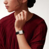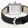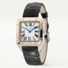 This small-sized Cartier Santos Dumont watch bears dimensions of 38 mm x 27.5 mm and Features a stainless steel case adorned with an 18ct rose gold bezel. A silvered satin-brushed dial is pierced with crisp black traditional Roman numeral hour markers and a set of sword-shaped central hands crafted from shimmering blued steel. Additional Features on the dial are the Cartier brand lettering and a discreet minute track running around the outer edge of the watch face. This small Cartier Santos Dumont watch is powered by an impeccable quartz movement, nestled inside a 30 meter water resistant case with a sealed caseback. The lady’s Cartier watch is completed with a sapphire glass front and secures to the wrist with a comfortable and classic black alligator leather strap and steel buckle for wearing with smart and relaxed attire.