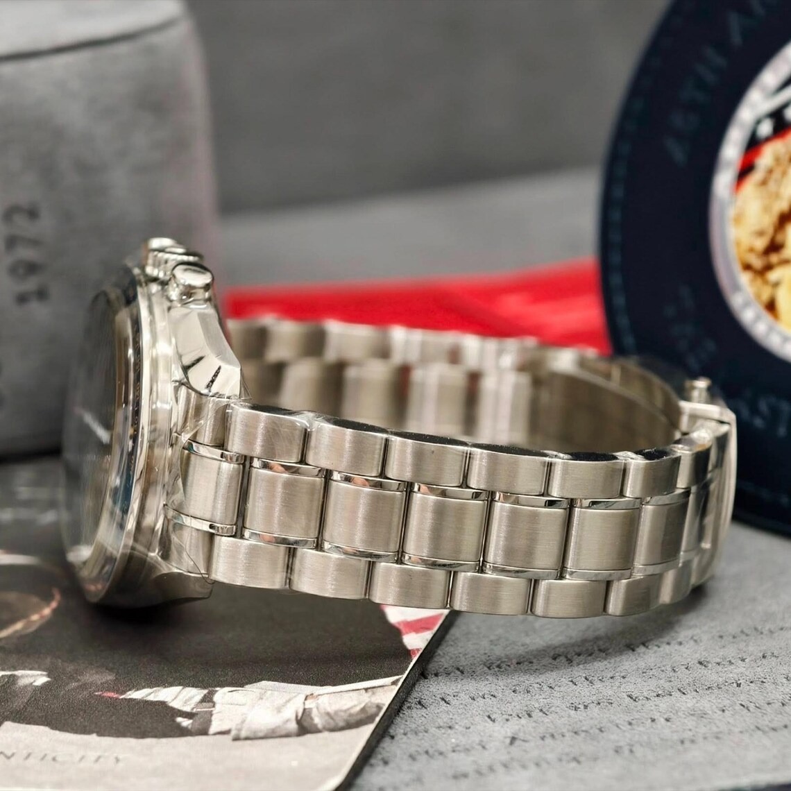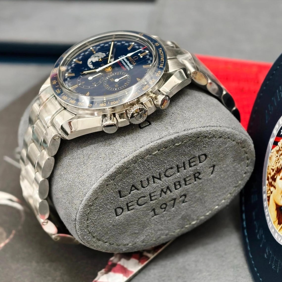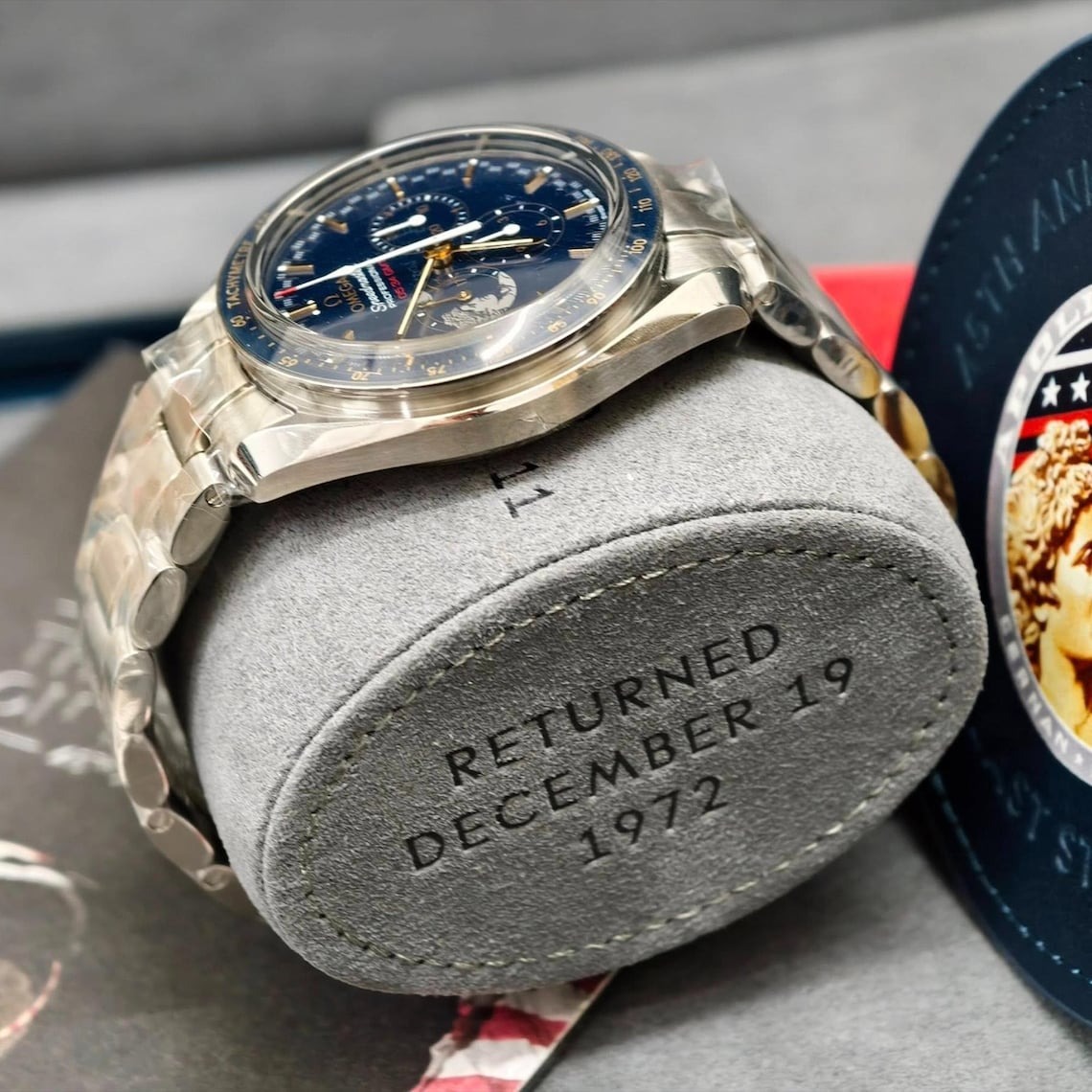 The watch has a stainless steel bracelet and is driven by the iconic OMEGA calibre 1861. The caseback is engraved with “45th ANNIVERSARY”, “Limited Edition” and a unique number. It also has an embossed Apollo XVII patch, “APOLLO XVII” and “a tribute to Gene Cernan”.