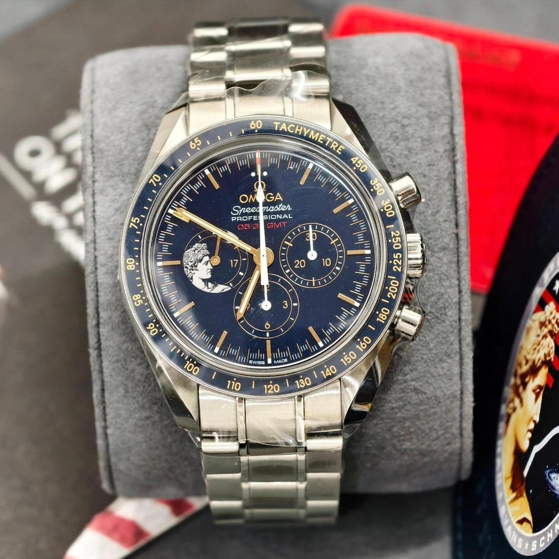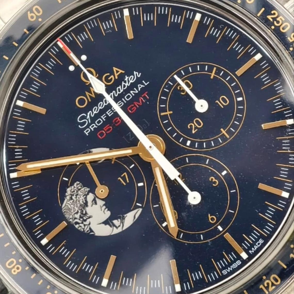 “05:34 GMT” is printed in red indicating the time that Cernan made the final step on the moon, while the 9 o’clock subdial is distinguished by a representation of the God Apollo and the moon – etched in PVD in a chrome colour.