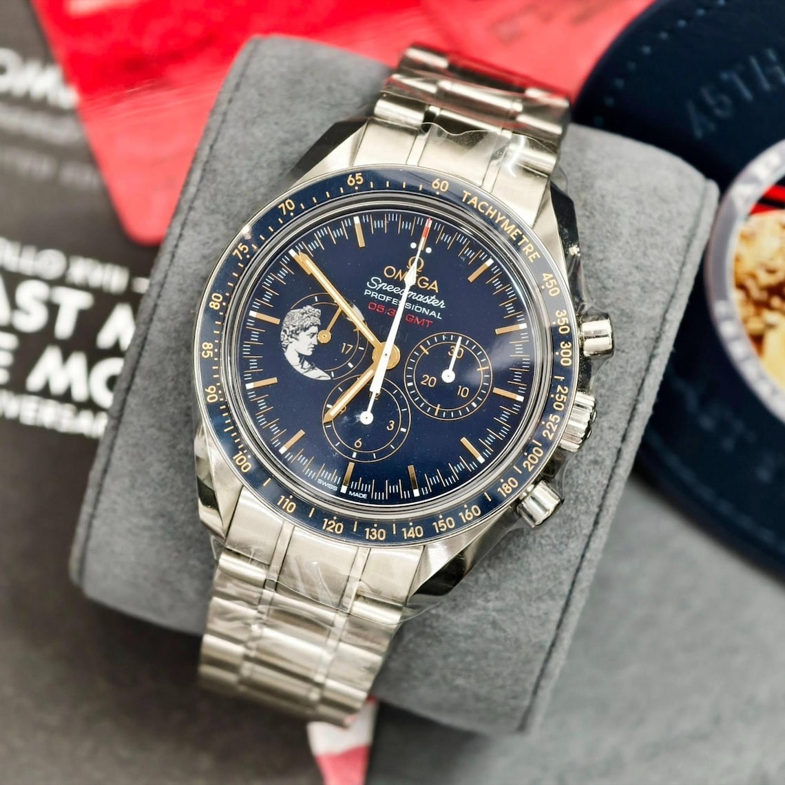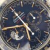 The 42 mm stainless steel case features a polished blue ceramic bezel with its tachymeter scale in OMEGA Ceragold™. The dial is also polished blue ceramic with 18K yellow gold indexes and hour-minute “Moon” hands that are coated in Super-LumiNova.