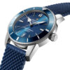Breitling Superocean Heritage II watch, 46mm, polished stainless steel case. Blue dial with a gold tone “B” emblem. Bold polished steel silver-tone hands with luminescent fill. Applied polished stainless steel index hour markers and painted luminescent dot hour markers. Printed minute/seconds track. Date window located at the 6 o’clock position. The dial protected by a scratch-resistant sapphire crystal. Screw down crown. Solid case back. Unidirectional rotating stainless steel bezel with a blue ceramic top ring. The Watch comes with Breitling Caliber B20, beats at 28’800 vph, contains 26 Jewels and has an approximate power reserve of 70 hours. The watch presented on the Aero Classic strap of blue rubber with Push Button Folding Clasp. The water resistance is up to 200m/660ft.