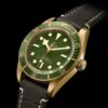 Luxury unworn watch Tudor Black Bay Fifty-Eight 18K, 39mm, Ref# M79018V-0001. The first TUDOR diver’s watch in a bold new version in solid 18K Yellow Gold. An incredibly beautiful, well-read multiimpressive domed Green dial is a feature of this model. It is decorated with luminescent large applied gold hour markers: round and rectangular at 3, 6 and 9 o’clock, as well as a luminous large triangle at 12 o’clock. On the outer perimeter of the dial, there is a gold minute-second scale. Spectacular completion of an amazing picture – golden arrows with a luminous fill. The hour and second hands feature the distinctive angular tips known to collectors as the “Snowflake”. Complementing all this charm is an 18k Yellow Gold screw-down winding crown, with the TUDOR rose in relief with circular satin-brushed 18k Yellow Gold winding crown tube. The dial closed by a Domed Scratch-resistant Sapphire Crystal. Sapphire-crystal too case back, which allows of the case, allows you to see the magical work of the movement An elegant feature of the model is a Unidirectional rotatable bezel in 18k Yellow Gold with 60-minute graduated disc in matt green anodised aluminium and gold gilded markings and numerals. The model is equipped with a manufacture Tudor Self-winding mechanical movement with bidirectional rotor system caliber MT5400, contains 27 jewels and has an approximate power reserve of 70 hours. This incredibly beautiful timepiece, a masterpiece of the manufacturer, is presented on a domed dark brown alligator strap with 18k Yellow Gold buckle. The watch comes with a Complimentary green fabric strap with gold-coloured band and 18k Yellow Gold buckle, included in the box. Water resistant up to 200m/660ft (20 ATM).